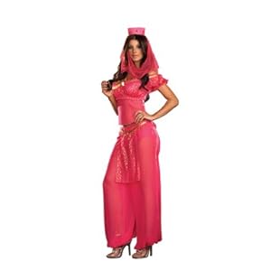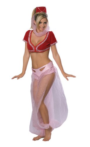 A bottle blonde for the ages! I Dream of Jeannie costume features the characteristic harem girl outfit as seen in the television series, including short sleeved top, pink pantaloons with matching panties and headpiece with pink veil.